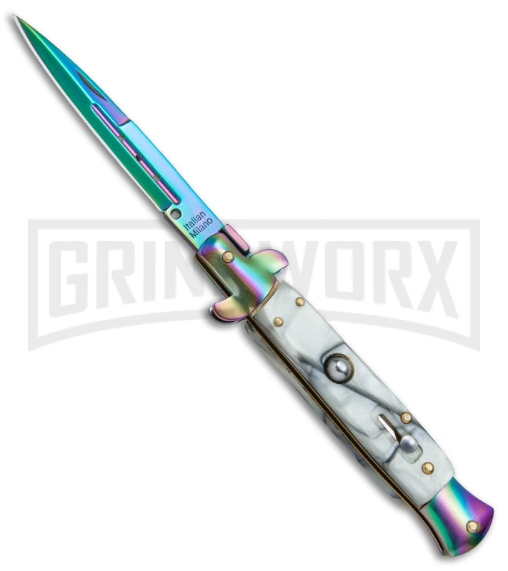 The Anomaly automatic knife is a budget version of the popular Italian stiletto automatic knife. Its handle is outfitted with stainless steel bolsters, push button, and sliding safety. Brass pins and liners add a classic touch to the design. The stainless steel blade comes in a spectrum finish with a plain edge. This Anomaly model offers everything you love about Italian stilettos without the imported price tag. Keep in mind this is more of a novelty or collection piece and not intended for hard EDC use.