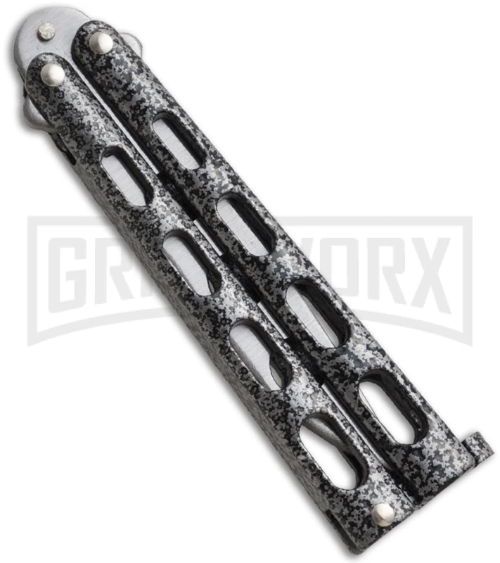 Bear Cutlery small butterfly knife trainer. The knife features a tough epoxy powder coating over zinc handles, which have been skeletonized to reduce weight. Stainless steel blade with dull edges. Durable tang pin construction. A nice USA made budget butterfly knife.