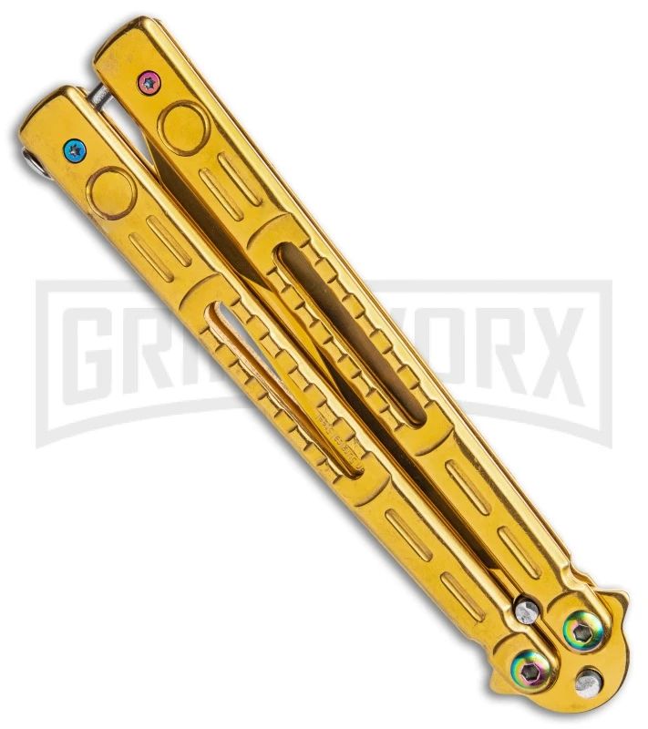 This Chalkhill has a tanto blade and skeletonized, gold finished handles.