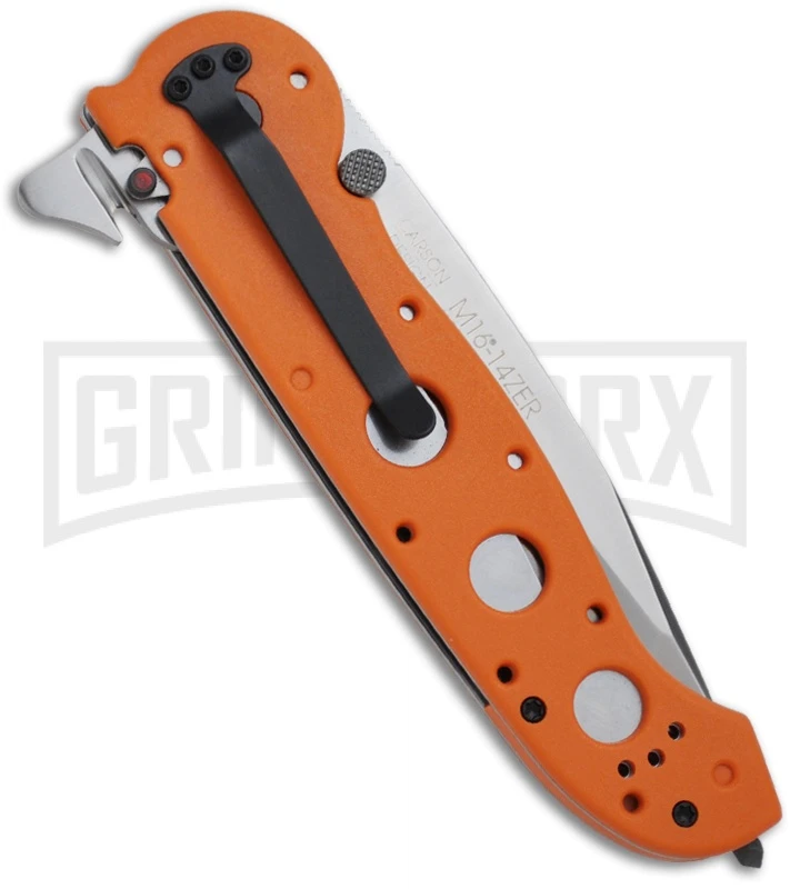 The Carson M16-14ZEK features a satin finished Tanto blade with a partially serrated cutting edge. The blade is easily opened with the dual thumb studs or a push of the Carson Flipper, which has an integrated seat belt cutter.