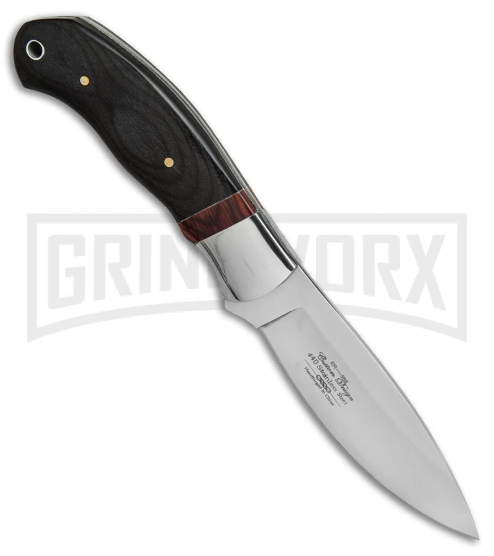 This lightweight hunting knife from Elk Ridge Knives features a black pakkawood handle and a drop point blade with a mirror polished finish. Polished steel bolsters and a brown pakkawood spacer add to the elegant appeal of the design. Item includes a leather belt sheath and a lanyard hole for comfortable everyday carry.