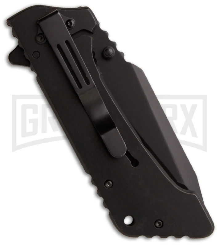The partially serrated 3.9″ blade is a modified tanto point made out of 7Cr17 steel and tactical black titanium coated. Deployment of the blade is accomplished via flipper or thumb studs. The handle features an aggressively textured front G-10 scale and steel frame lock on back with a deep carry tip-down pocket clip.