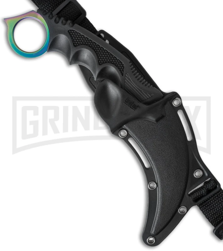 The Honshu Rainbow Tini Karambit is an excellent defense weapon that includes a hard-molded plastic sheath with straps for shoulder harness. The blade is 7CR13 stainless steel with a spectrum finish, and the handle features textured rubber overmold grip and an open hole pommel for more secure handling.
